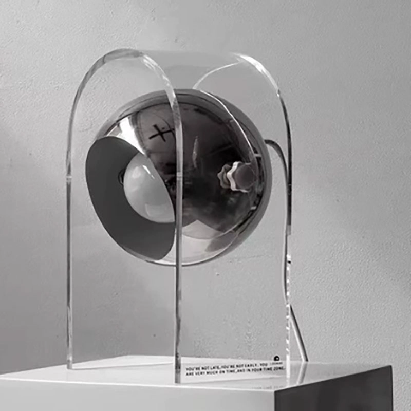 Brighten up your space with this contemporary table lamp that has a unique design. The lamp provides a glowing warm soft light when turned on as your main light source all surrounded by a metal lamp housing and clear acrylic mounting and easy minimalist styling that embodies the clean architectural design style the lamp displays. The metal lamp housing creates a warm glowing statement under the lamp shade that contrasts against the holding acrylic mounting, all while maintaining the lamp shade and bulb floating in a very minimalist sensibility.