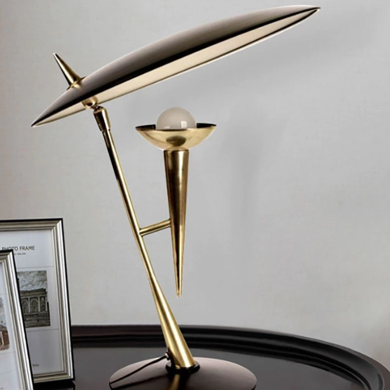 Bring elegance to your room with this sculptural mid-century modern table lamp with space-age icon design. Constructed from futuristic brass construction and standing on a rounded black base, the lamp boasts dramatic asymmetrical styling which is striking from every direction.